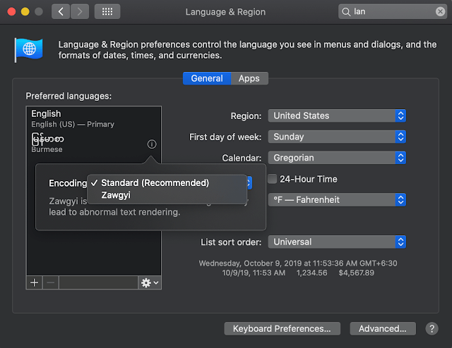 Mac OS Catalina မှာ မြန်မာယူနီကုဒ်ပါပေမယ့် သူတို့ဖက်ကမှားတာလား တမင်လုပ်လိုက်တာလားတော့ မသိဘူး ဇော်ဂျီက default ဖြစ်နေပါလိမ့်မယ် အဲ့လိုဖြစ်နေလို့ ယူနီကုဒ်ကို ပြောင်းချင်ရင်တော့ system preference ကနေ language and region ကိုဝင်ပြီး Burmese မှာ Standard (Recommended) လို့ ဝင်ပြင်ပေးလိုက်ရင်ရပါပြီ နမူနာပုံလဲပြပေးထားပါတယ် ကြည့်ကြည့်ပါ