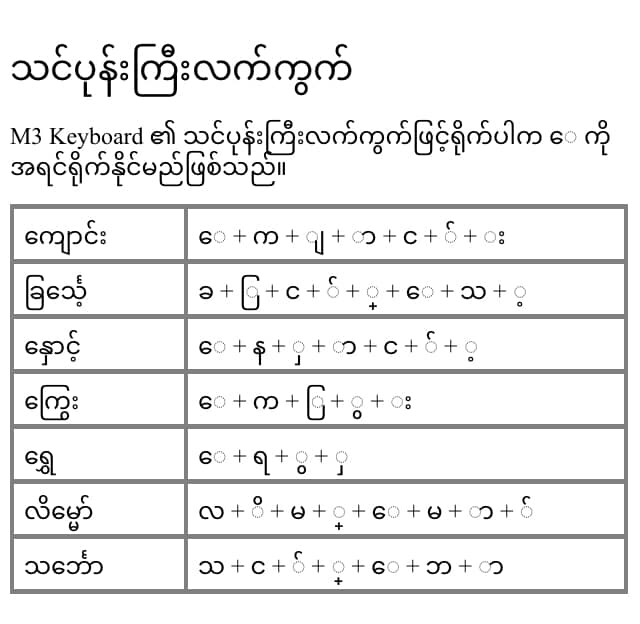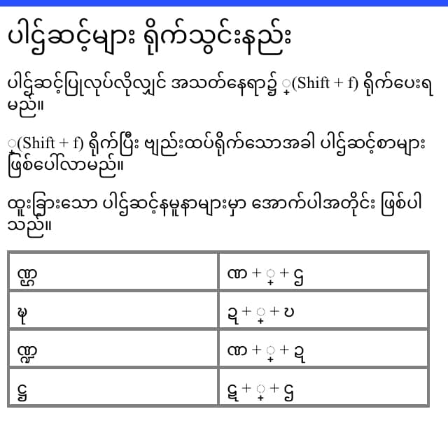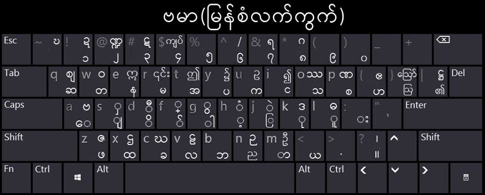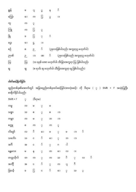 နောက်ဆုံးတစ်ခုကတော့ ပါဌ်ဆင့်ရိုက်နည်းပါပဲ ဒီဟာကတော့ ဘယ်ကီးဘုတ်ကိုပဲသုံးသုံး ဒီနည်းနဲ့ပဲရိုက်ရမှာပါ နမူနာပုံမှာကြည့်ပါ