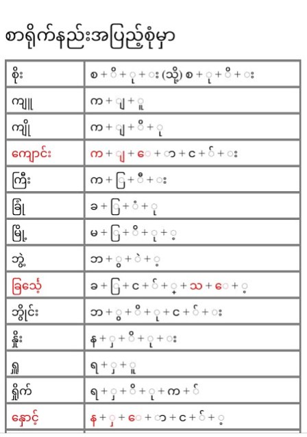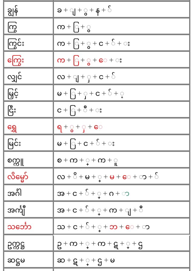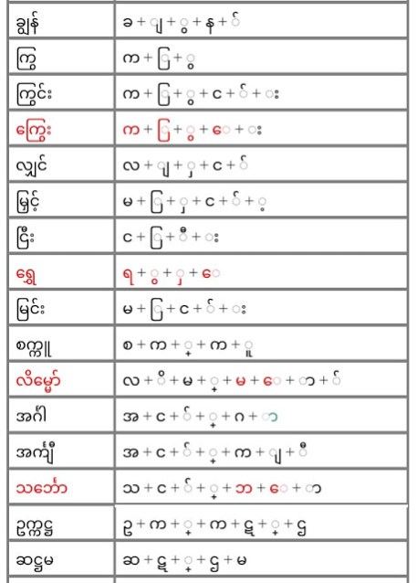 | ကျောင်း | = ေ + ကျ + ာ + င် + း |